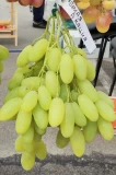 Ягоды «дамский пальчик», молочно-белые, очень крупные (около 12-16 г. и до 22 г., 18х54 мм.), мякоть очень плотная, сравнима с яблоком. Очень сладкая с приятным сортовым вкусом зеленого яблока. Ягода не трещит после дождей и не горошит.